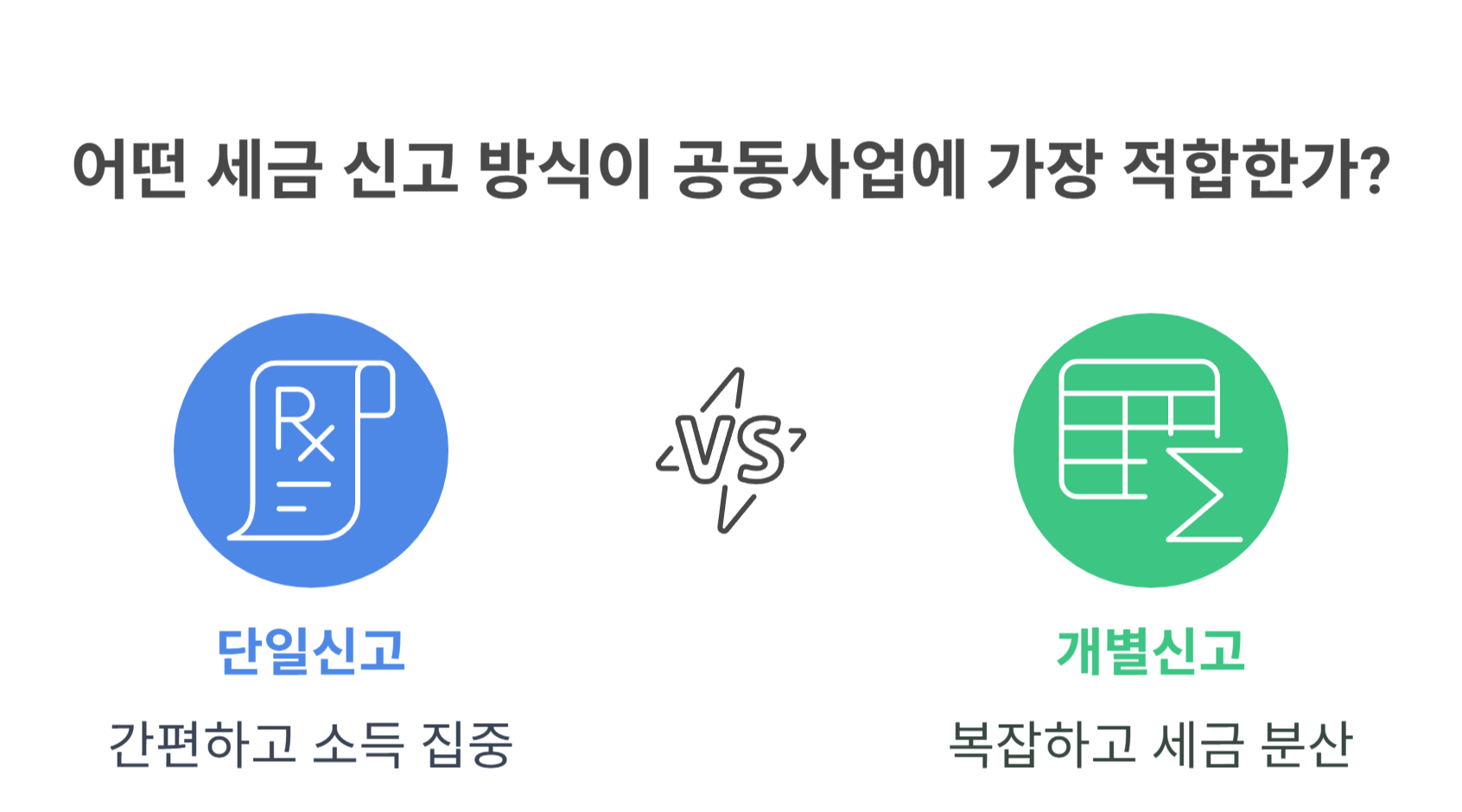 • 단일신고: 간편하고 한 사람이 책임지지만, 소득 집중으로 누진세 적용 높음