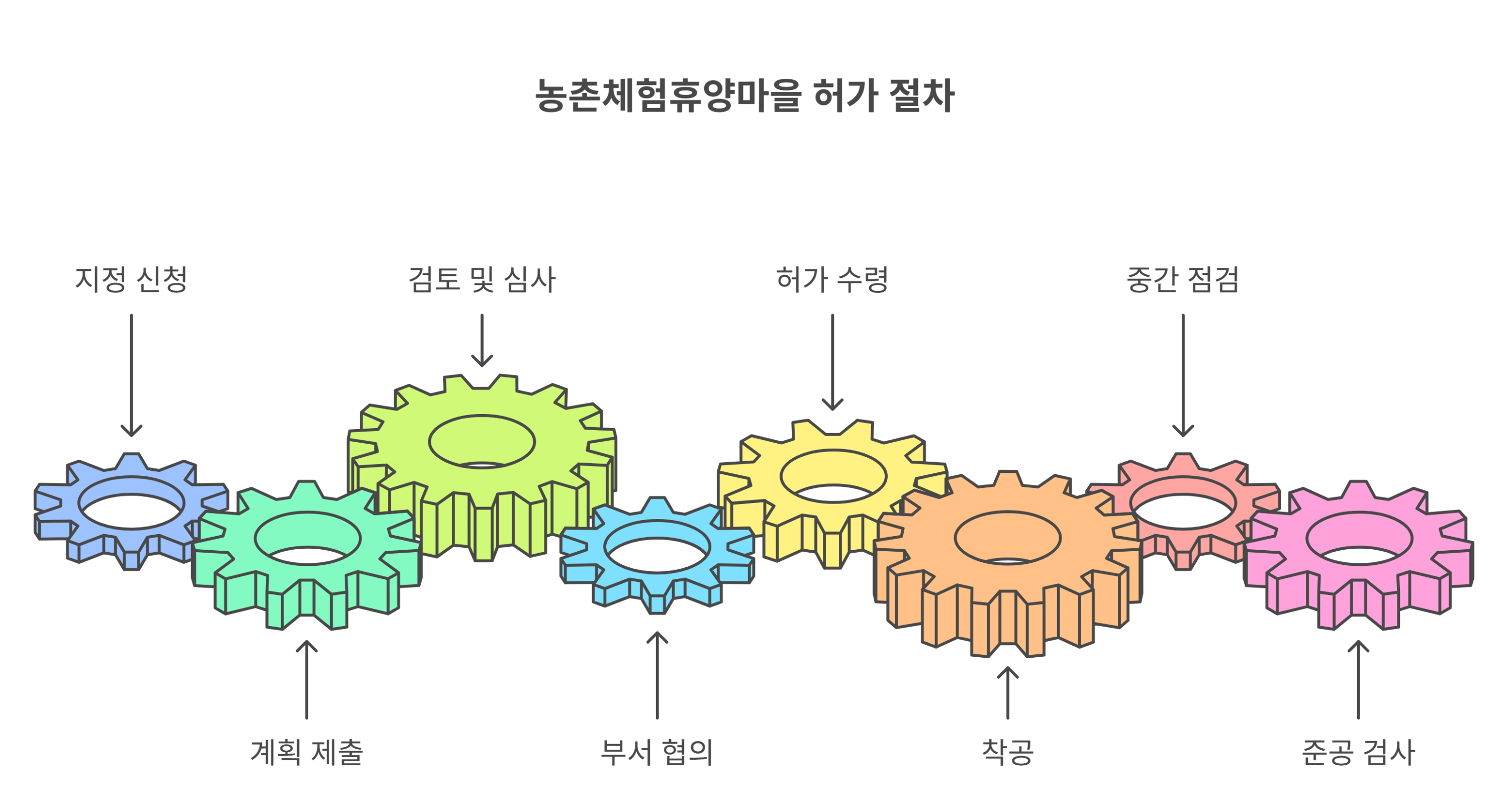 농촌체험휴양마을 시설을 만들기 위해선 사전 허가 → 계획 승인 → 착공 → 사후관리로 이어지는 행정 절차를 반드시 따라야 해요.