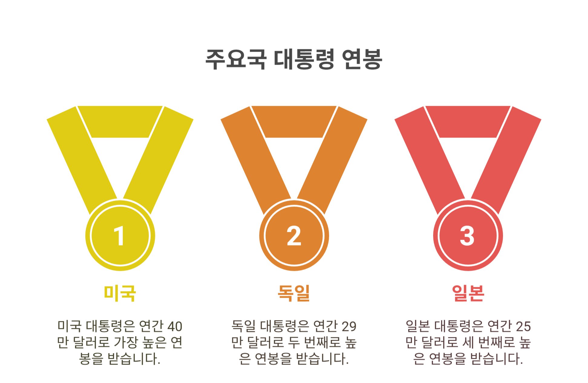 🌍 흥미로운 점: 우리나라 대통령의 연봉은 주요 선진국 대비 다소 낮은 편이며, 정치적 책임과 국민 기대 수준을 반영한 결과로 해석됩니다.