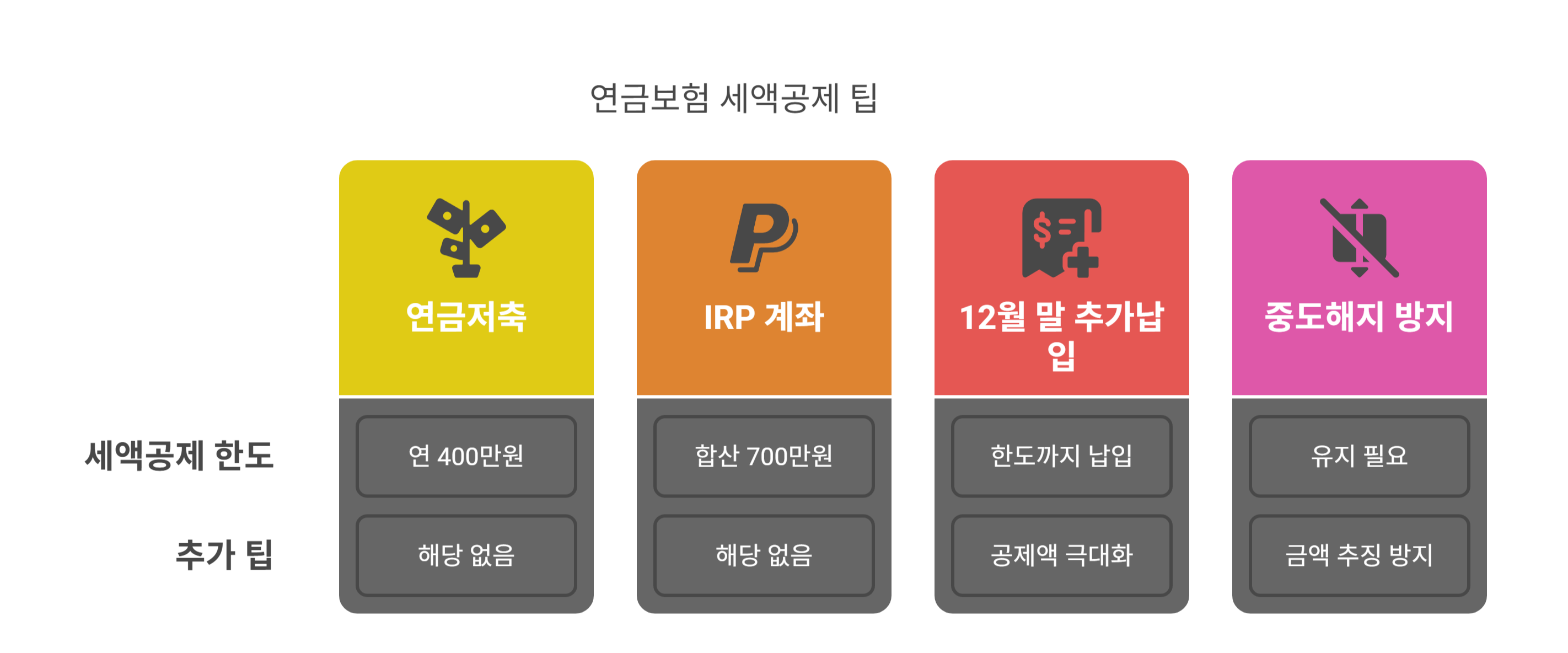 | ① 연금저축 + IRP 계좌 활용 | 합산 700만 원까지 세액공제 확대 |