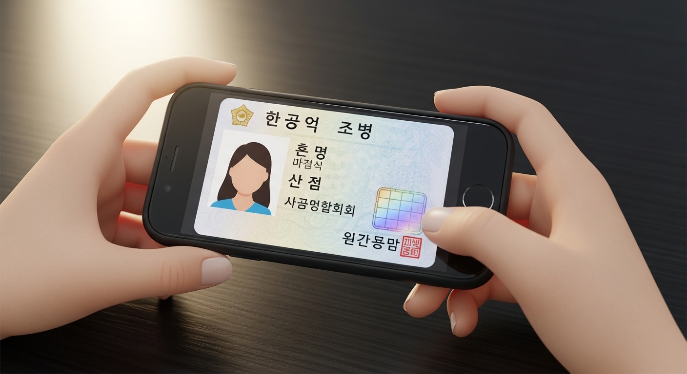 행정안전부의 '모바일 신분증 앱'이나 통신사의 'PASS 앱', 또는 '삼성월렛' 등에 저장된 신분증입니다. 이를 이용하면 카메라 촬영 없이 비밀번호나 생체인증만으로 신분 확인이 끝납니다.
