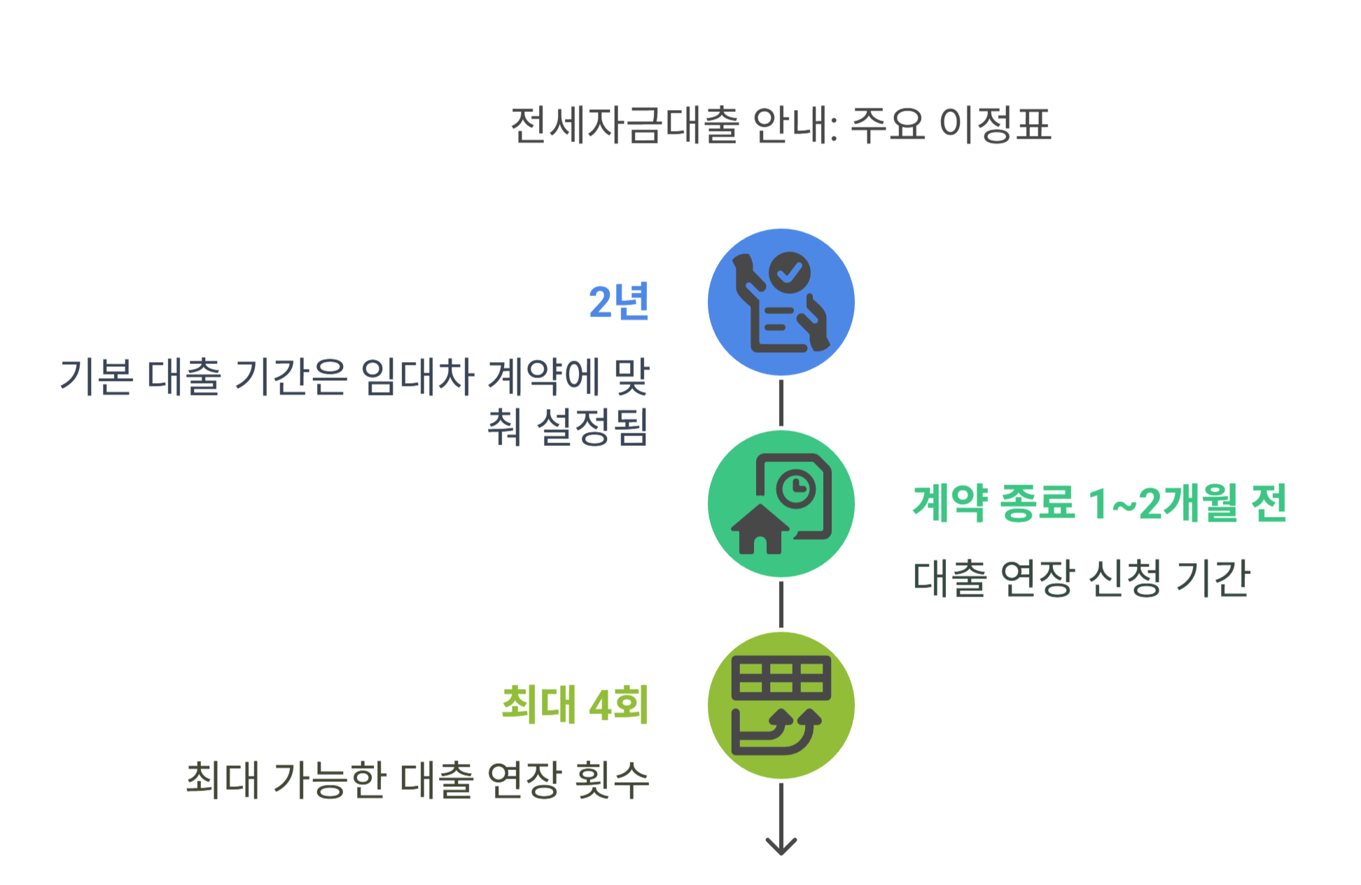 💡 중요: 연장 심사는 신규 대출보다 엄격할 수 있어요. 계약 종료 1~2달 전부터 준비하는 것이 좋아요.