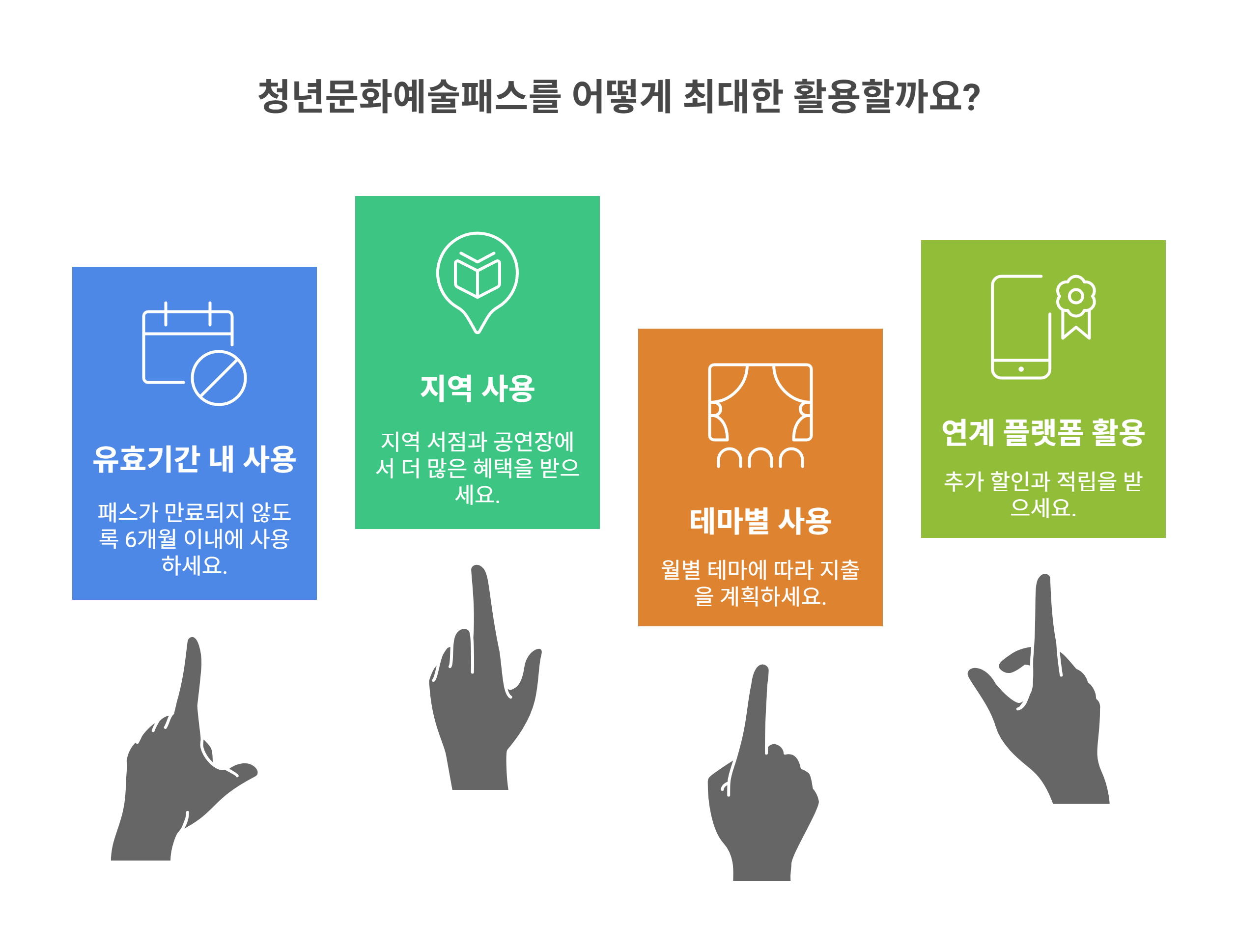 - 달마다 문화 일정을 세우고 미리 예매·구매해두면 활용도가 훨씬 높아집니다.
