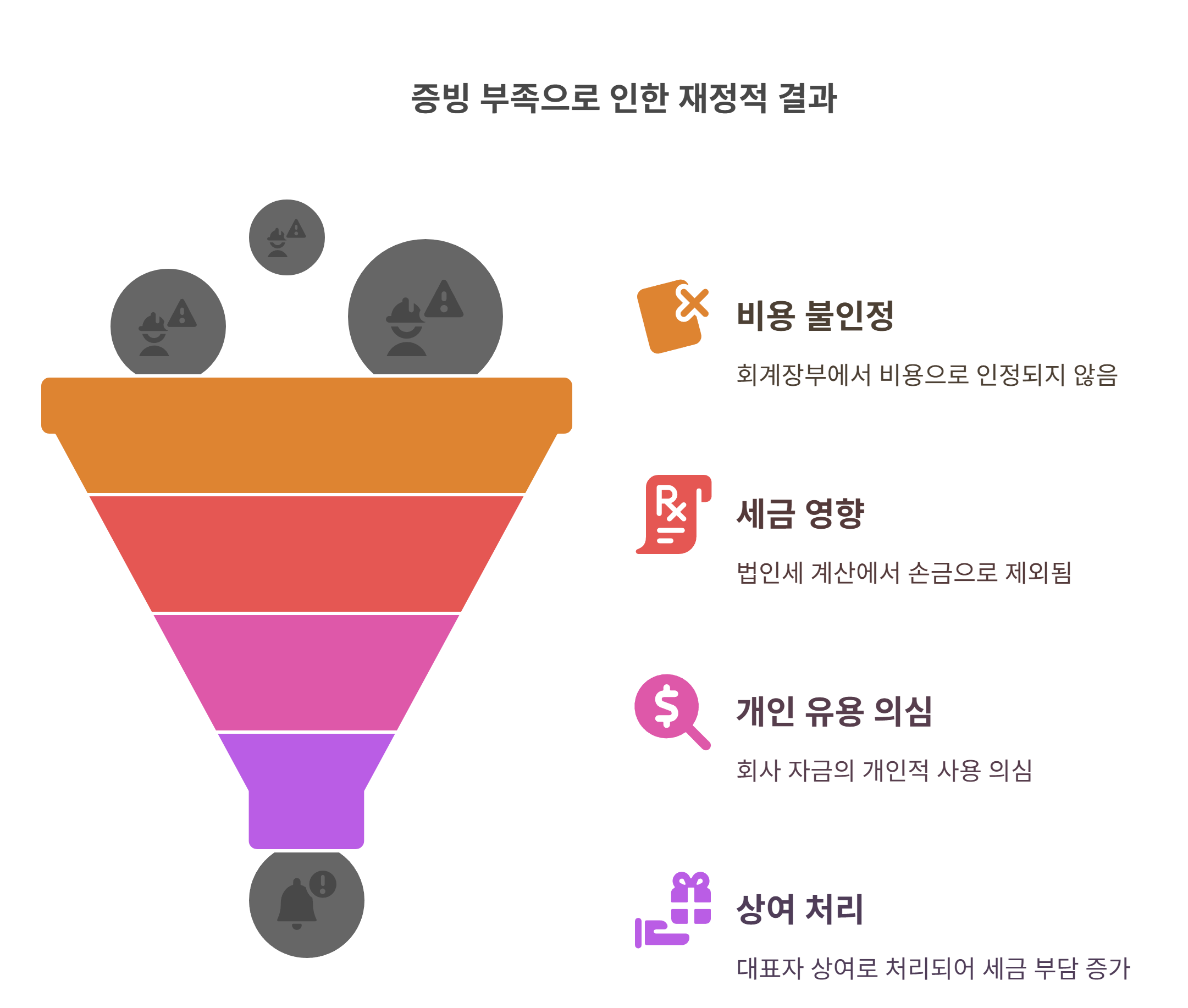 | 지출 증빙 없음 | 세무상 비용 불인정 | 법인세 증가 |