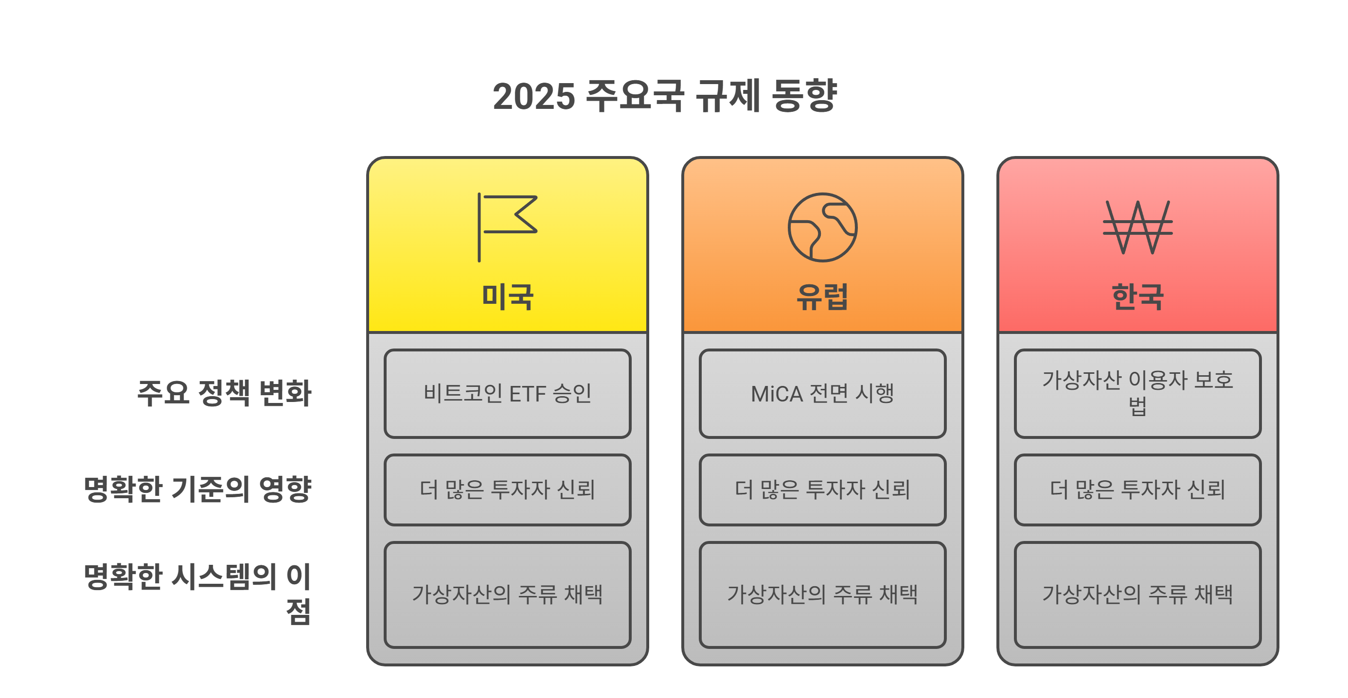 초기에는 규제=악재로 여겨졌지만, 이제는 제도화된 시장 환경이 기관투자자 유입과 시장 신뢰도 향상의 필수 조건이 되었어요.