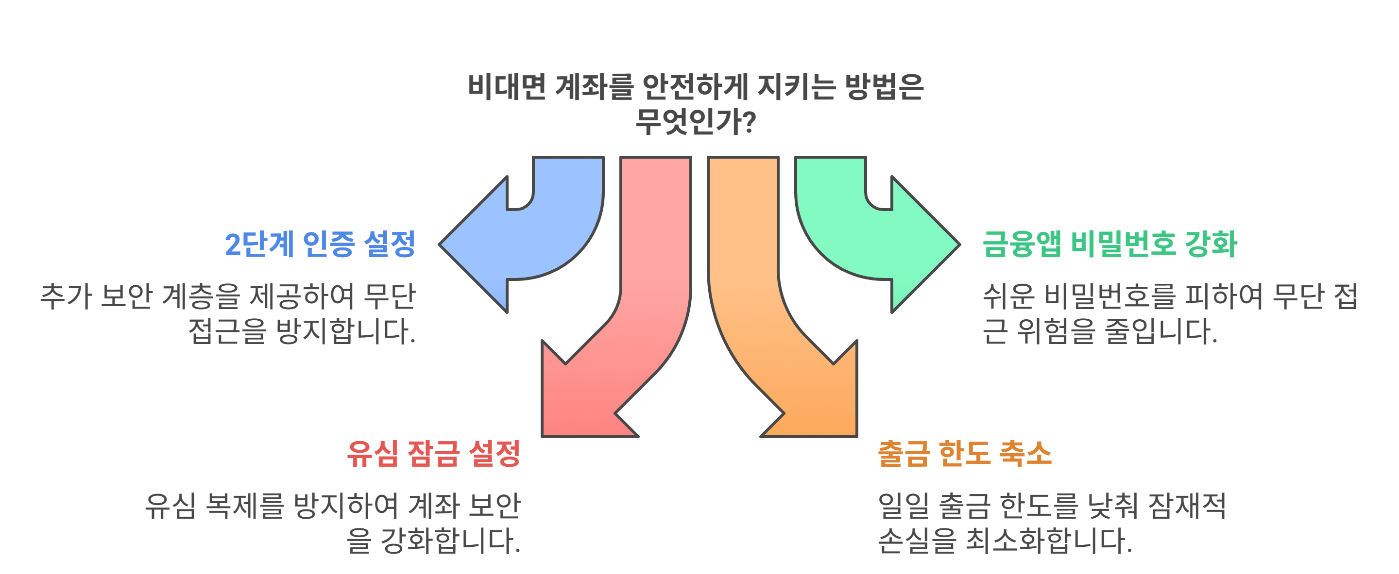 기존 비대면 계좌에도 2단계 인증 추가, 출금 한도 설정, 비밀번호 강화 등의 보안 조치를 즉시 적용하는 것이 좋습니다.
